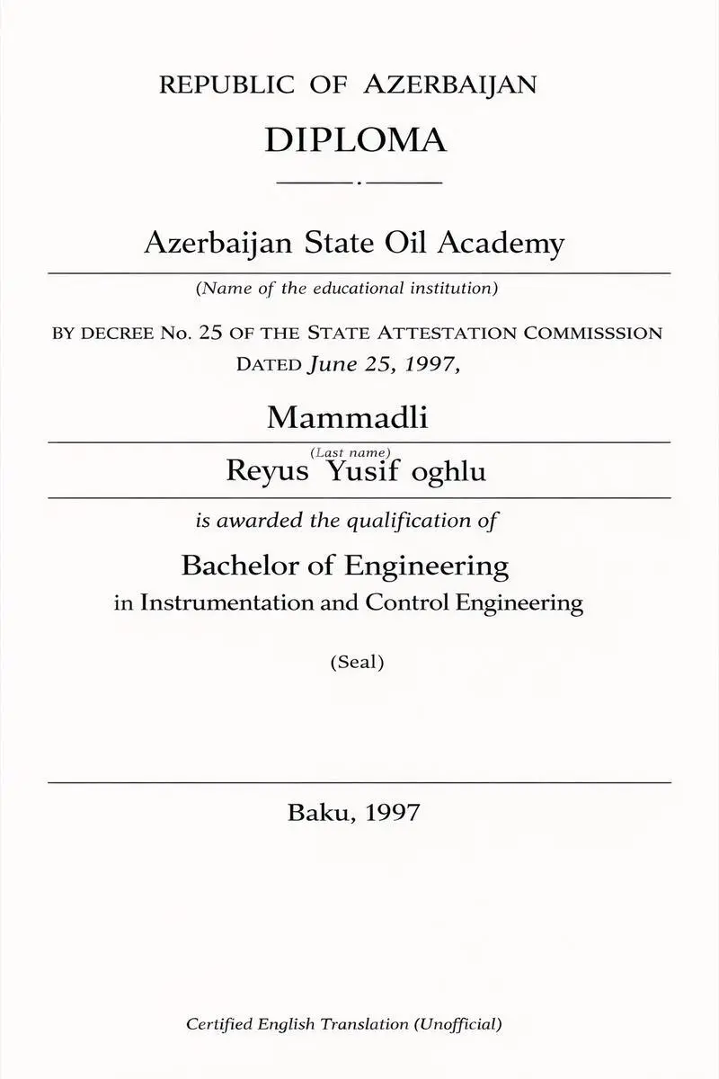 Diploma in Engineering, specializing in “Biotechnical and Medical Devices and Systems”, issued to Reyus Mammadli by the Azerbaijan State Oil Academy. I earned my degree from the Azerbaijan State Oil Academy (now ASOIU), a historic institution established in 1920 that has been a cornerstone of technical and engineering education in the region for over a century. (Azerbaijan State Oil and Industry University (Note: Please select “EN” in the top header for English) or view the university profile on Wikipedia.)